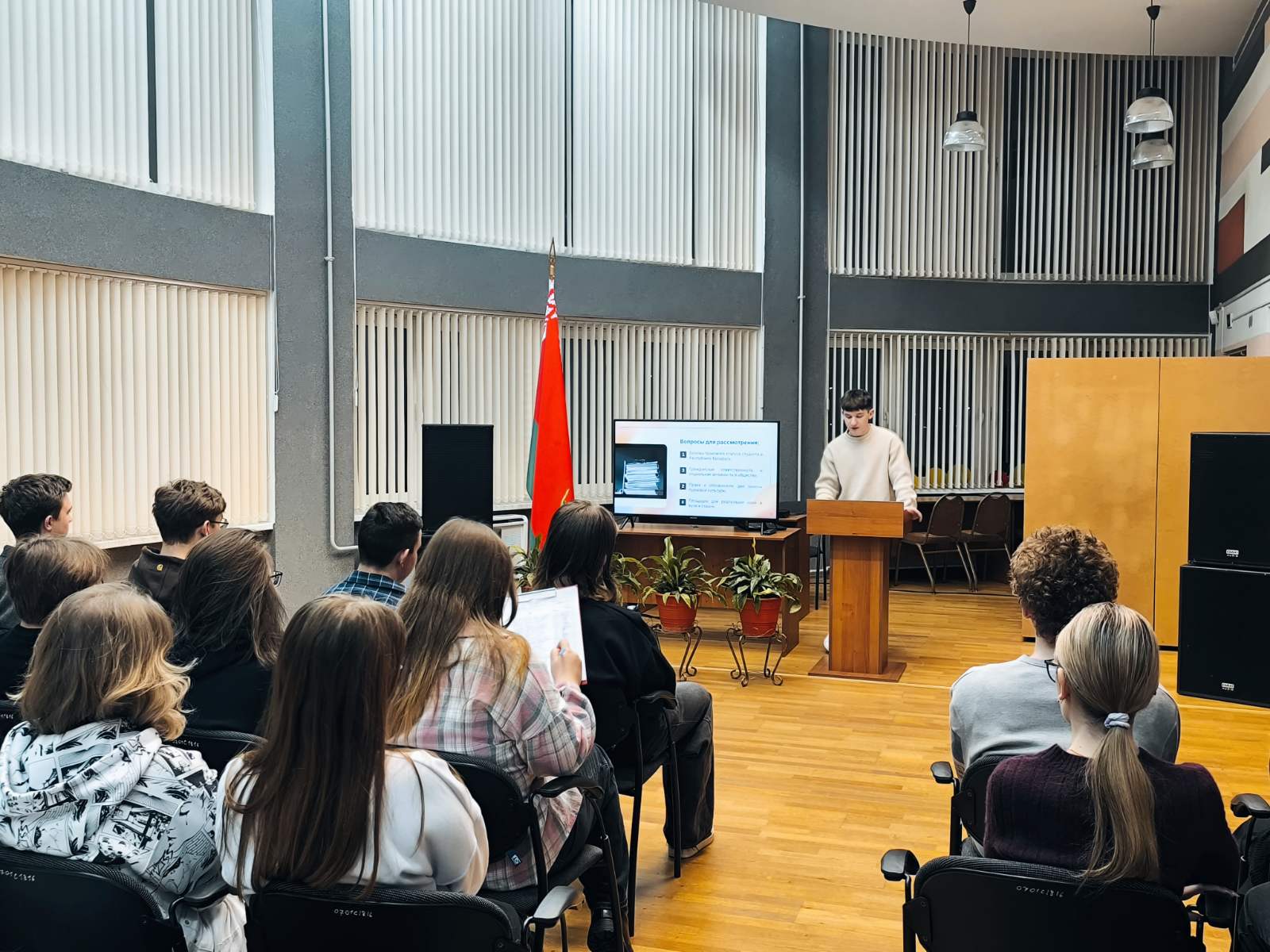 14 декабря в общежитии №4 состоялась диалоговая площадка «От правовой грамотности - к гражданской ответственности». Модератором площадки стал председатель информационной комиссии Кирилл Козицкий. Студенты рассмотрели вопросы прав и обязанностей студентов в РБ, обсудили вопросы гражданской ответственности и активной социальной позиции в обществе. А также, первокурсникам были предложены площадки для реализации своих идей в университете и стране.