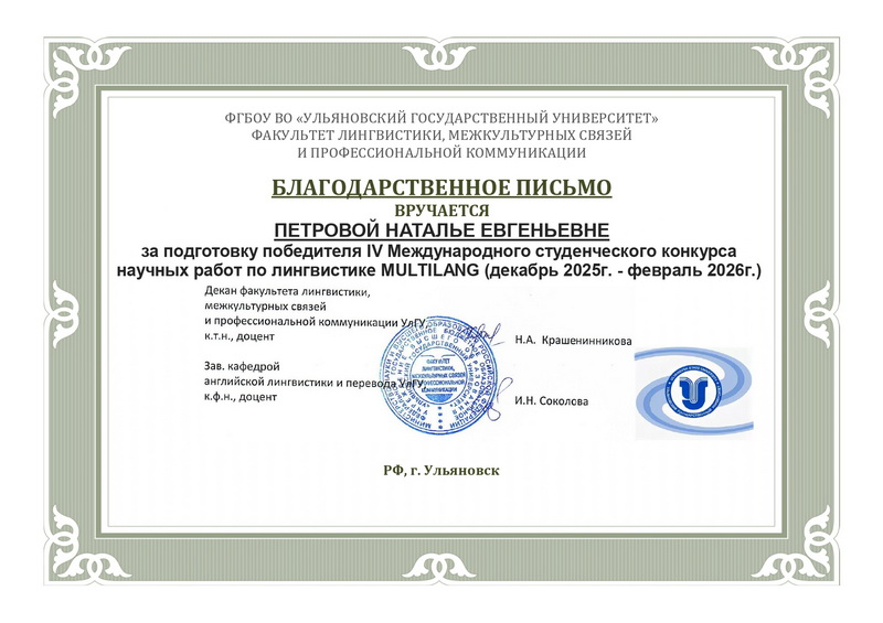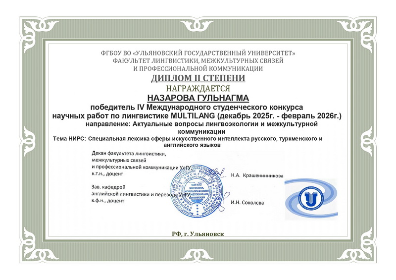 В декабре 2025 г. - феврале 2026 г. в Ульяновском государственном университете (г. Ульяновск, Россия) на факультете лингвистики, межкультурных связей и профессиональный коммуникации прошёл IV Международный студенческий конкурс научных работ по лингвистике и филологии «Multilang». Иностранная студентка БГУИР Назарова Гульнагма победила в конкурсе с научной работой «Специальная лексика сферы искусственного интеллекта русского, туркменского и английского языков». Работа была подготовлена под руководством доцента кафедры общеобразовательных дисциплин Петровой Натальи Евгеньевны.