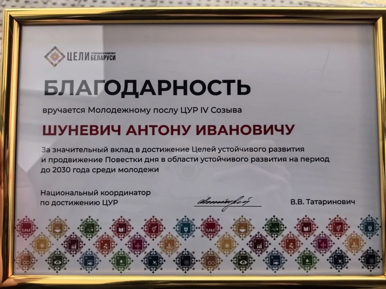 Молодежный посол ЦУР IV Созыва, студент факультета информационной безопасности БГУИР Антон Шуневич удостоен Благодарности за значительный вклад в достижение Целей устойчивого развития и Продвижение повестки дня в области устойчивого развития на период до 2030 года среди молодежи