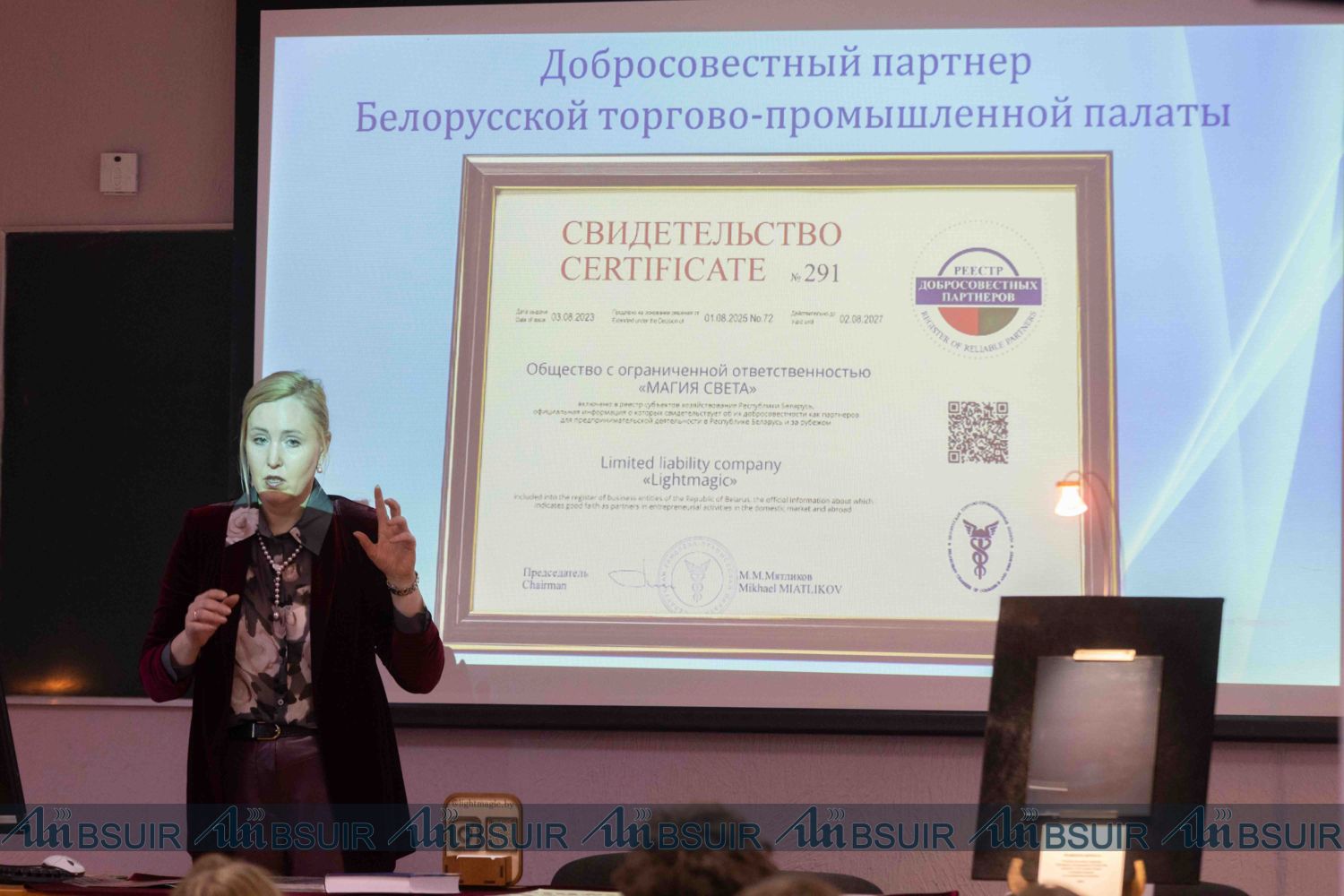 В Белорусском государственном университете информатики и радиоэлектроники прошла встреча студентов с руководством инновационного научно-технического предприятия «Магия света». Генеральный директор предприятия Людмила Танина и председатель научно-технического совета «Магия света», доктор физико-математических наук Леонид Танин представили достижения предприятия в области голографических технологий.