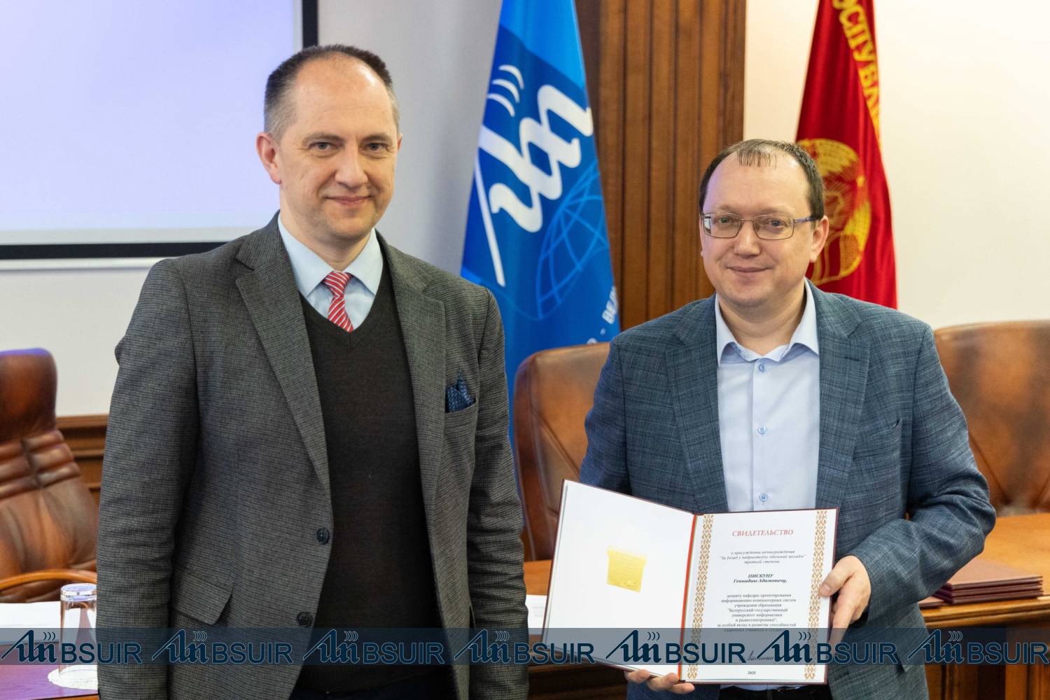 Свидетельство о поощрении специального фонда Президента Республики Беларусь лучшим педагогическим работникам, эффективно работающим с одаренными учащимися и студентами вручено доценту кафедры проектирования информационно-компьютерных систем Геннадию Пискуну.